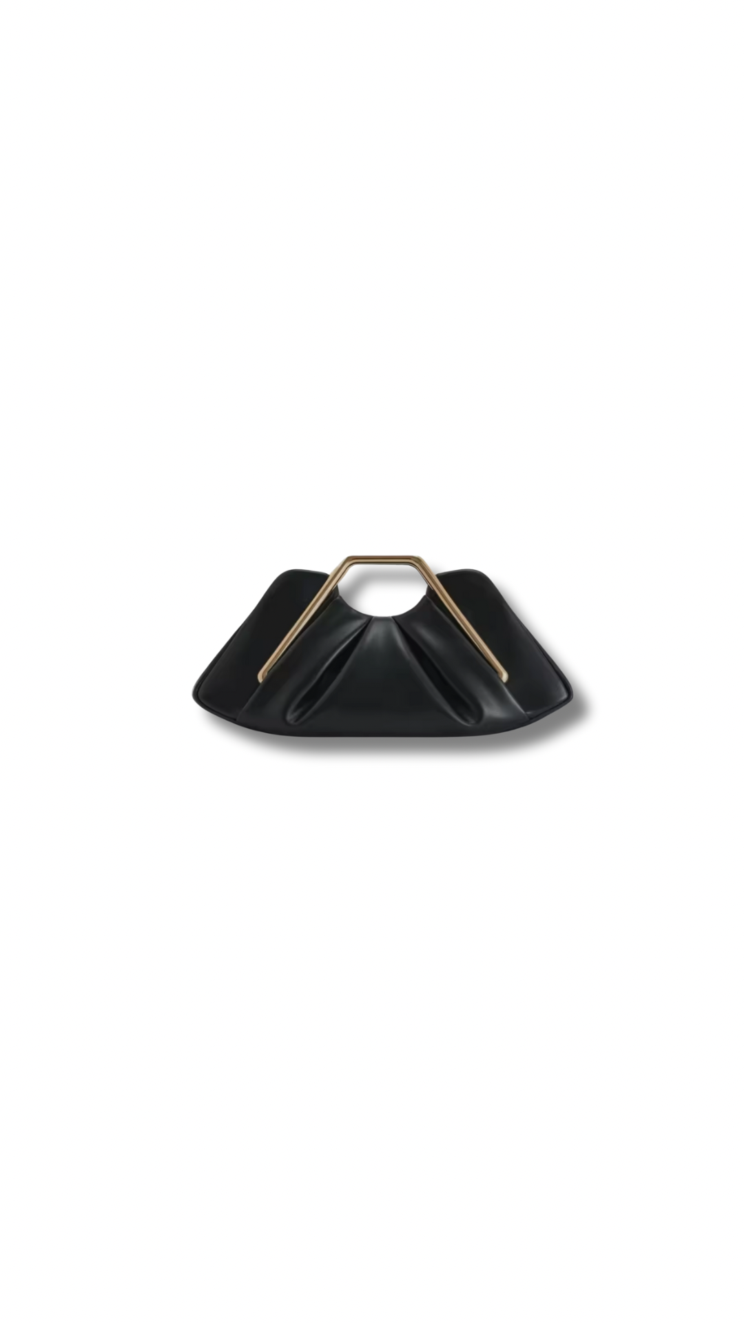 Borsa a mano in ecopelle liscia color nero, dal design strutturato e contemporaneo. Il manico è geometrico in metallo dorato. La forma morbida e leggermente drappeggiata contrasta elegantemente con le linee nette del manico, creando un equilibrio tra stile minimal e glamour. Perfetta da abbinare a look da sera o outfit eleganti da giorno.