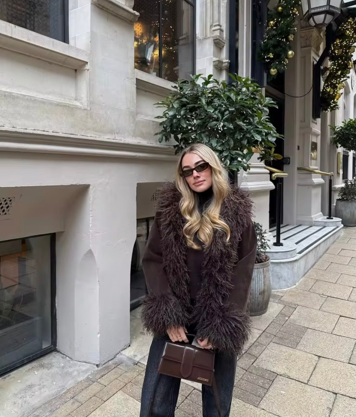 Giacca autunnale in pelliccia sintetica stile vintage in marrone scuro.